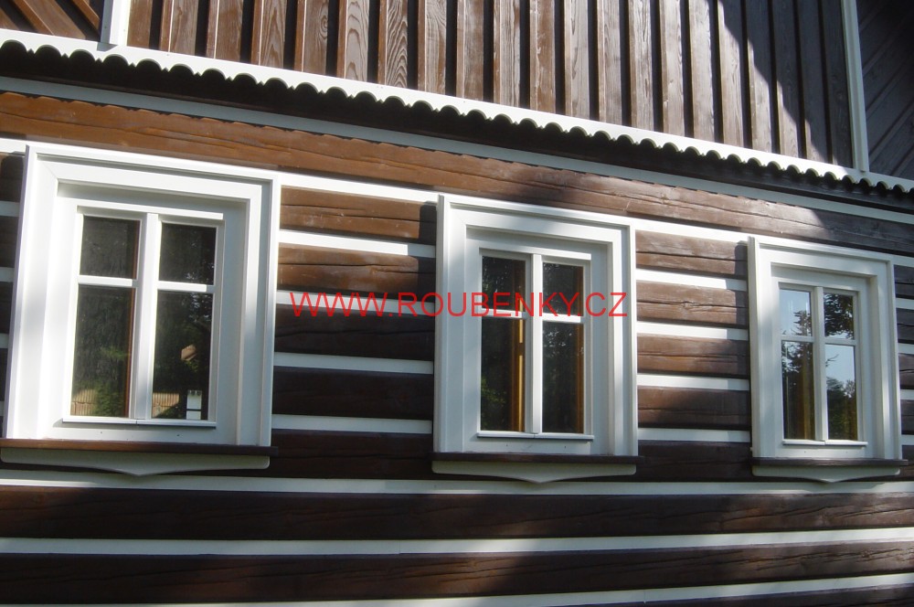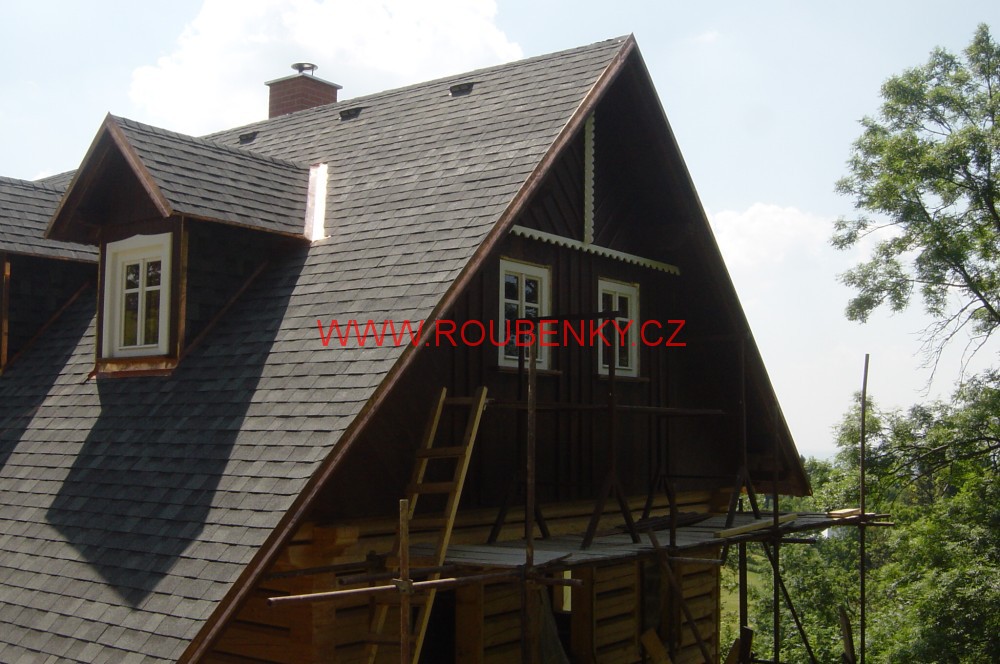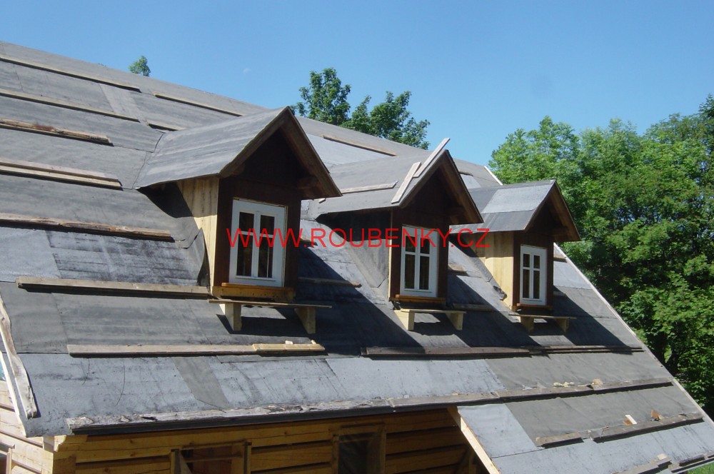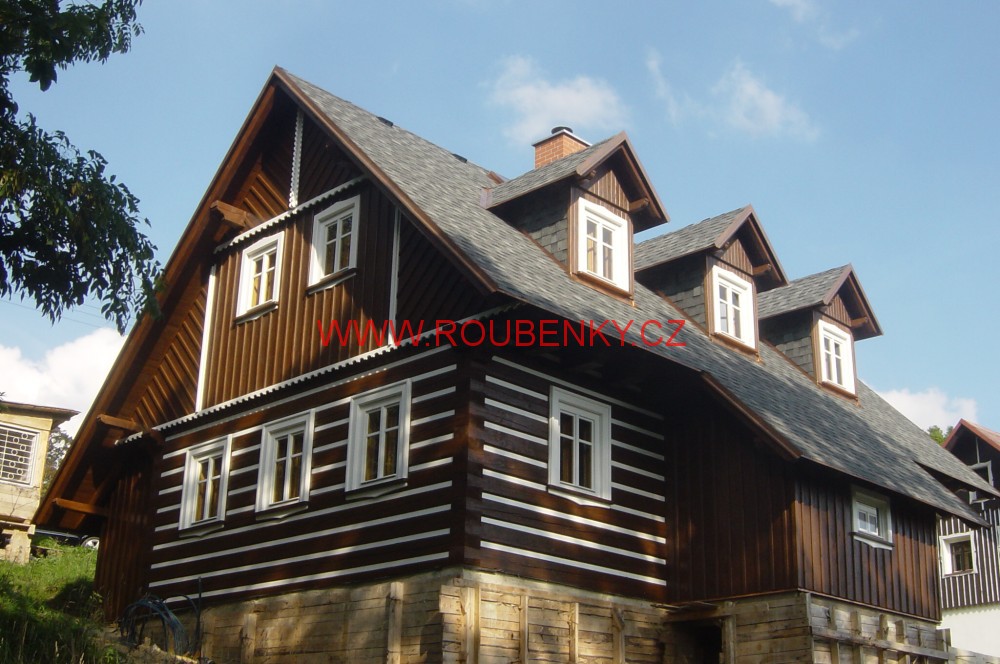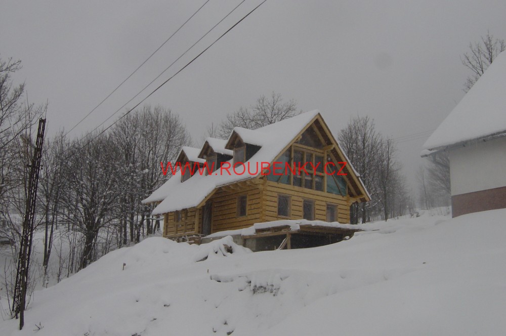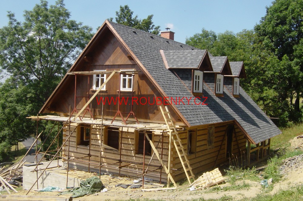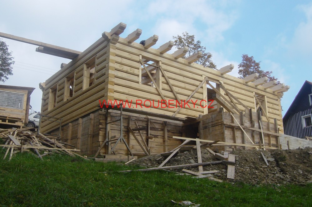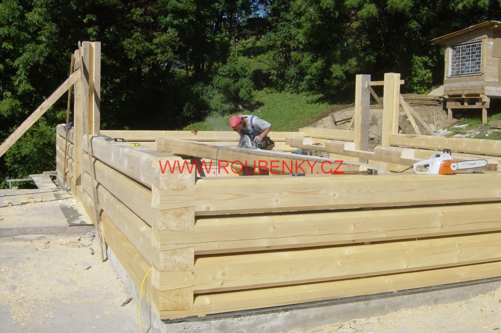 Fotografie ze stavby roubené chalupy, kterou jsme stavěli v Jestřabí v Krkonoších.