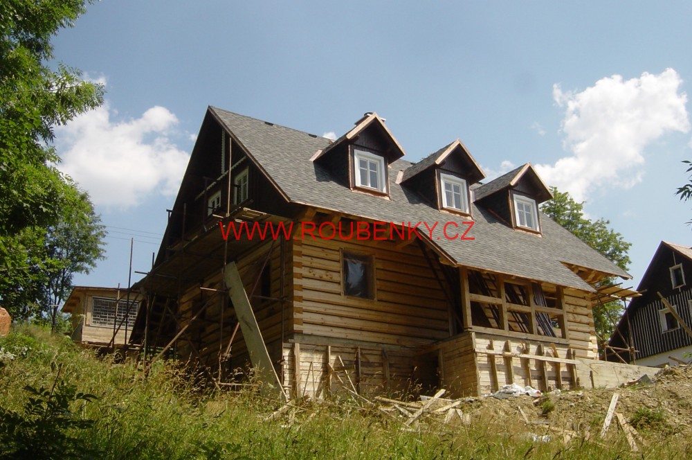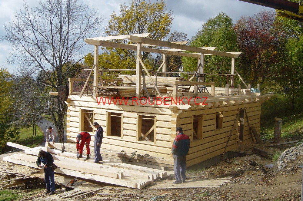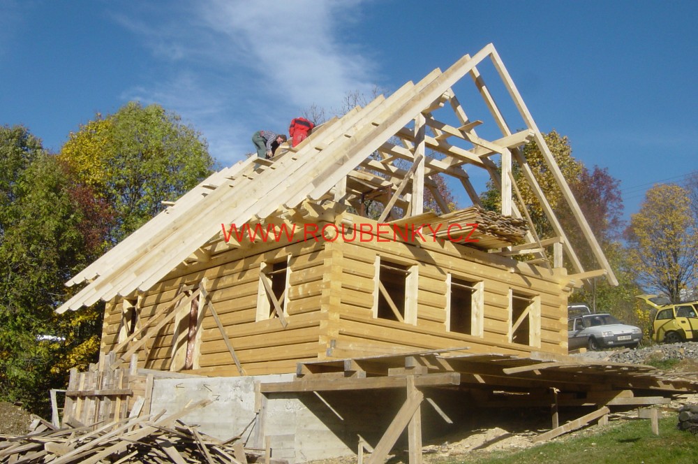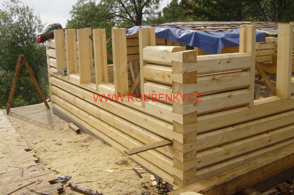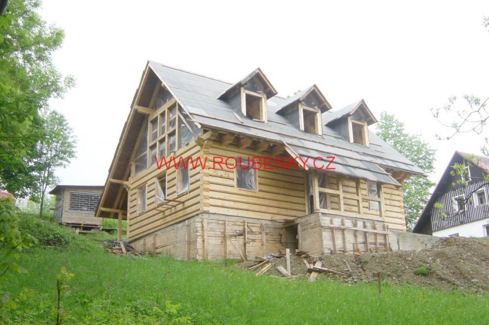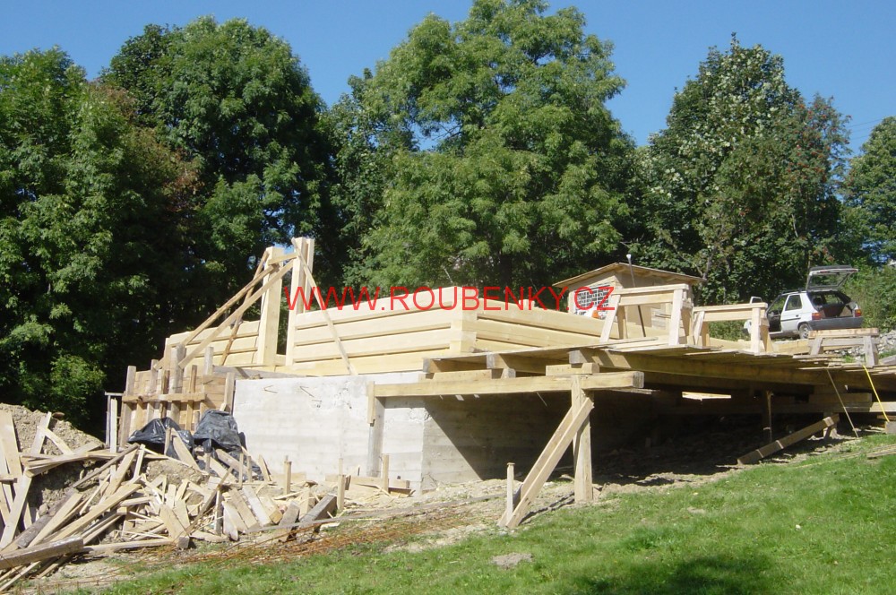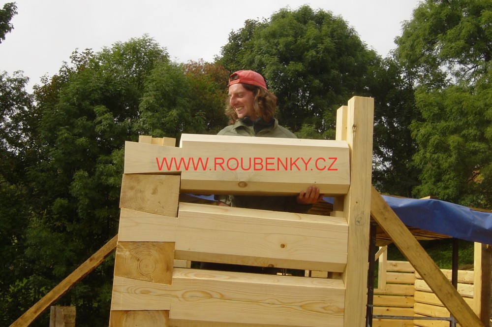 Fotografie ze stavby roubené chalupy, kterou jsme stavěli v Jestřabí v Krkonoších.